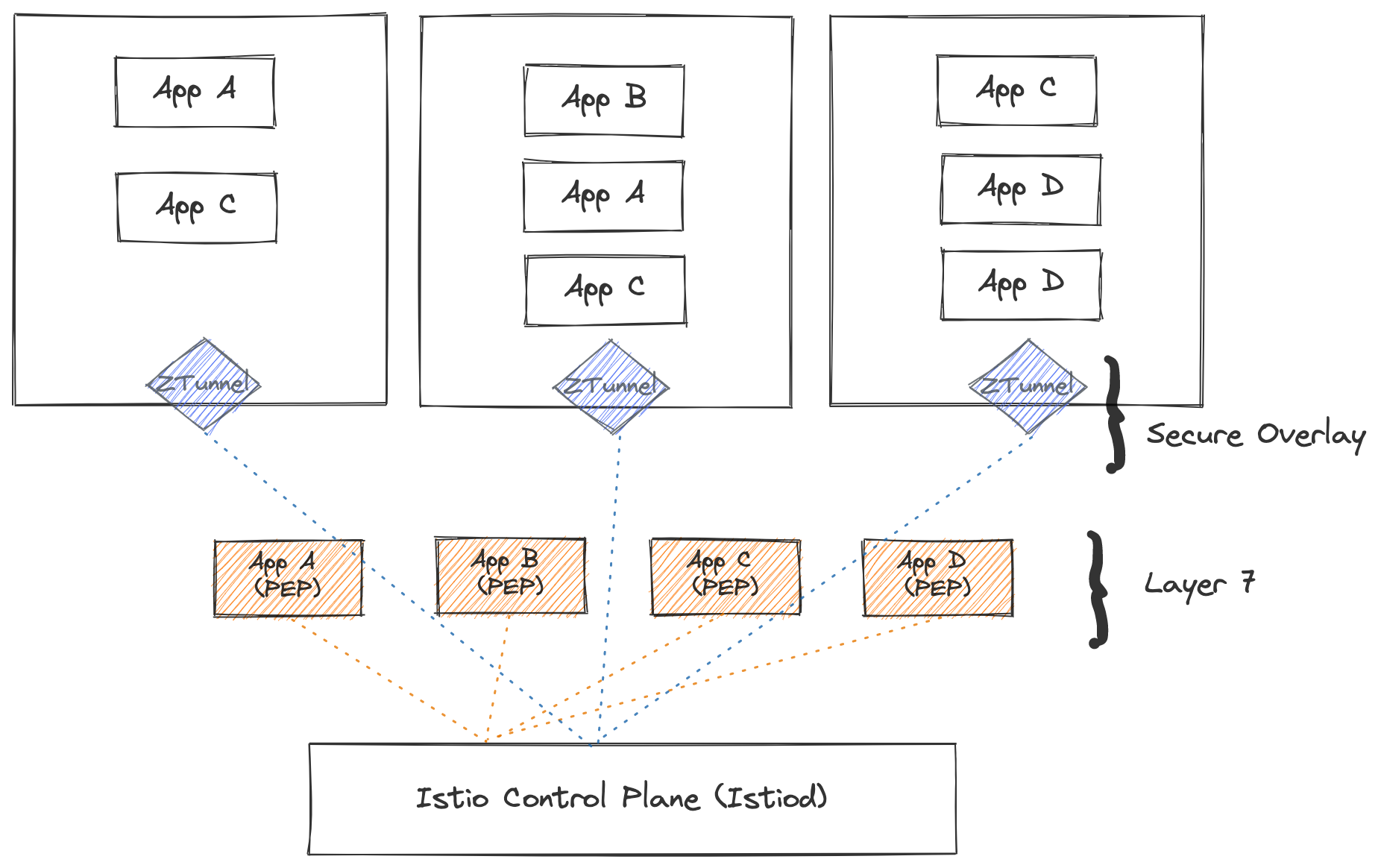 El ztunnel usa una credencial distinta para cada pod, que solo se emite si el pod se está ejecutando actualmente en el nodo. Esto asegura que, si un ztunnel se compromete, el “blast radius” queda limitado a que solo podrían robarse credenciales de pods actualmente programados en ese nodo. Esta propiedad es similar a la de otras infraestructuras compartidas por nodo bien implementadas, incluyendo implementaciones seguras de CNI. El ztunnel no usa credenciales de clúster completo ni credenciales por nodo que, si se robaran, podrían comprometer inmediatamente todo el tráfico de aplicaciones del clúster, a menos que también se implemente un complejo mecanismo secundario de autorización.