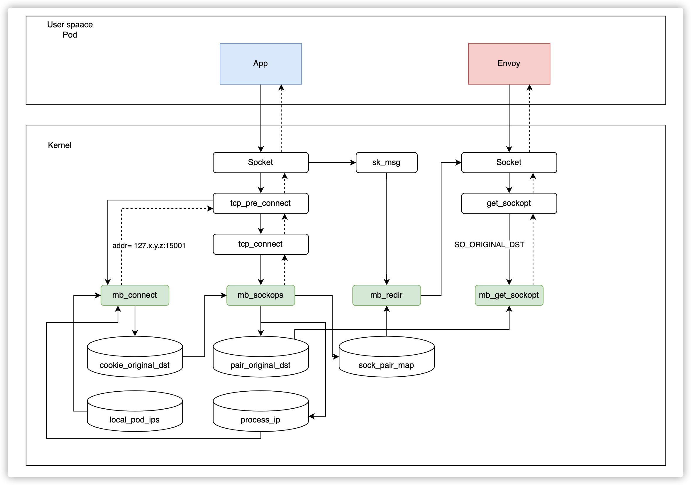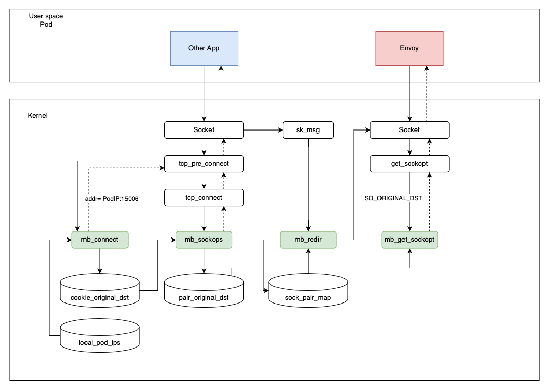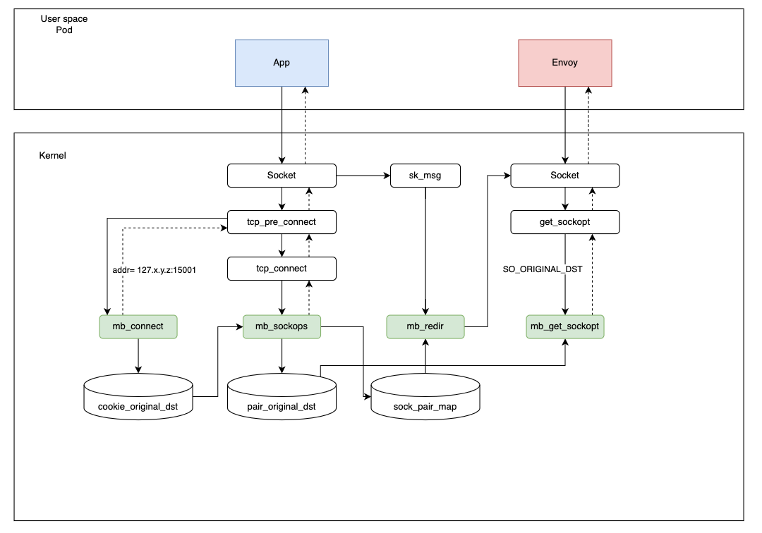 Como se mencionó anteriormente, queremos usar sockops de eBPF para evitar iptables y acelerar las peticiones de red. Al mismo tiempo, no queremos modificar ninguna parte de Istio, para que Merbridge sea totalmente adaptable a la versión de la comunidad. Como resultado, necesitamos simular en eBPF lo que hace iptables.
