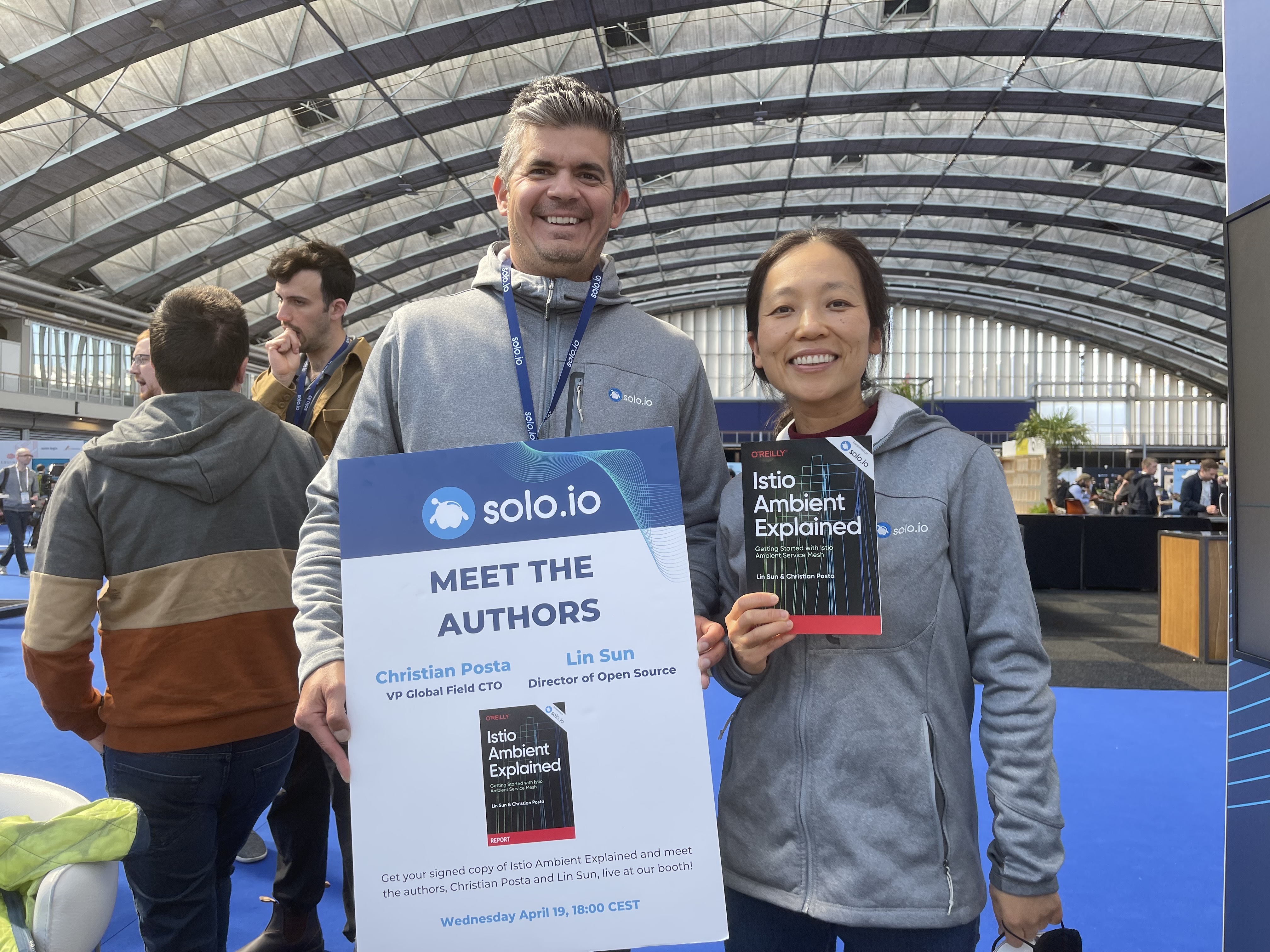 Otro punto destacado fue que los miembros del TOC y directivos de Istio y autores Lin Sun y Christian Posta firmaron copias del libro “Istio Ambient Explained”.