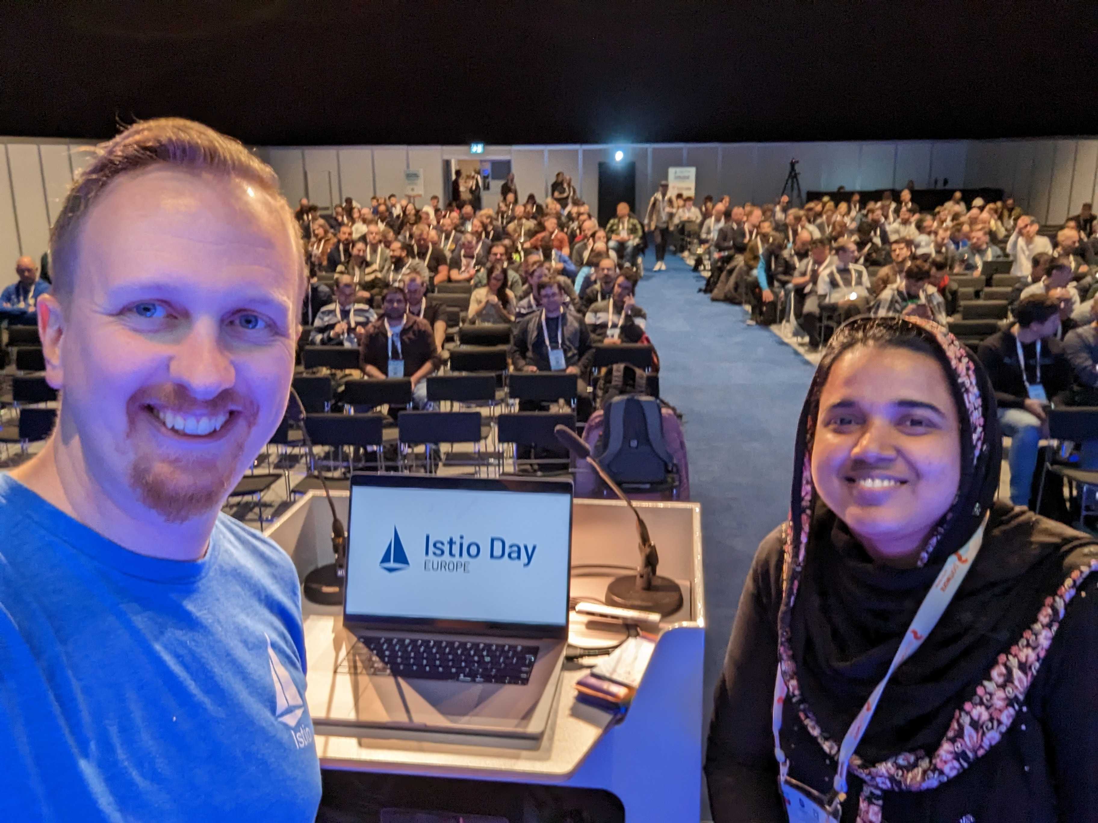 Esto fue seguido por una sesión de actualización de la hoja de ruta de 2023 de los miembros del TOC Lin Sun y Louis Ryan. Tuvimos nuestra muy esperada sesión sobre la postura de seguridad de Ambient Mesh, de Christian Posta y John Howard, que generó algunas discusiones interesantes en la comunidad. Después de esto pasamos a nuestra primera charla de usuario final de John Keates de Wehkamp, una empresa holandesa local, seguida por ponentes de Bloomberg, Alexa Griffith y Zhenni Fu, sobre cómo aseguran su información financiera altamente privilegiada usando Istio. Istio Day fue testigo de más enfoque en seguridad, que se hizo aún más prominente cuando Zack Butcher habló sobre usar Istio para cumplimiento de controles. También tuvimos charlas relámpago cubriendo entornos de desarrollo de Istio más rápidos, guía para aislamiento de recursos de Istio y asegurando despliegues en nube híbrida de Mitch Connors, Zhonghu Xu y Matt Turner respectivamente.